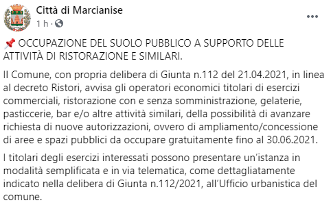 Questo il post pubblicato sulla pagina Facebook 'Città di Marcianise': "Occupazione del suolo pubblico a supporto delle attività di ristorazione e similari. Il Comune - si legge nel post - con propria delibera di Giunta n.112 del 21.04.2021, in linea al decreto Ristori, avvisa gli operatori economici titolari di esercizi commerciali, ristorazione con e senza somministrazione, gelaterie, pasticcerie, bar e/o altre attività similari, della possibilità di avanzare richiesta di nuove autorizzazioni, ovvero di ampliamento/concessione di aree e spazi pubblici da occupare gratuitamente fino al 30.06.2021. I titolari - prosegue il post - degli esercizi interessati possono presentare un’istanza in modalità semplificata e in via telematica, come dettagliatamente indicato nella delibera di Giunta n.112/2021, all’Ufficio urbanistica del comune".