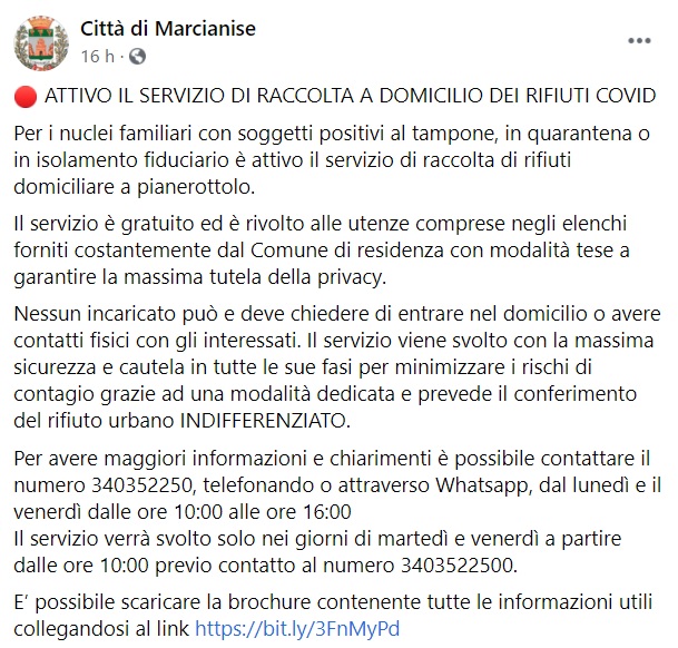 "ATTIVO IL SERVIZIO DI RACCOLTA A DOMICILIO DEI RIFIUTI COVID. Per i nuclei familiari con soggetti positivi al tampone, in quarantena o in isolamento fiduciario è attivo il servizio di raccolta di rifiuti domiciliare a pianerottolo. Il servizio- si legge nella nota- è gratuito ed è rivolto alle utenze comprese negli elenchi forniti costantemente dal Comune di residenza con modalità tese a garantire la massima tutela della privacy. Nessun incaricato può e deve chiedere di entrare nel domicilio o avere contatti fisici con gli interessati. Il servizio viene svolto con la massima sicurezza e cautela in tutte le sue fasi per minimizzare i rischi di contagio grazie ad una modalità dedicata e prevede il conferimento del rifiuto urbano INDIFFERENZIATO. Per avere maggiori informazioni e chiarimenti è possibile contattare il numero 340352250, telefonando o attraverso Whatsapp, dal lunedì e il venerdì dalle ore 10:00 alle ore 16:00. Il servizio- si legge nella nota- verrà svolto solo nei giorni di martedì e venerdì a partire dalle ore 10:00 previo contatto al numero 3403522500. E’ possibile scaricare la brochure contenente tutte le informazioni utili collegandosi al link https://bit.ly/3FnMyPd"