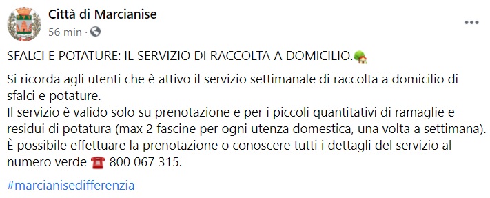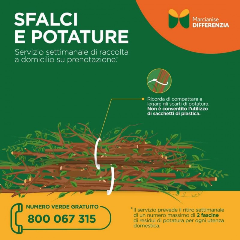 "SFALCI E POTATURE: IL SERVIZIO DI RACCOLTA A DOMICILIO. Si ricorda agli utenti che è attivo il servizio settimanale di raccolta a domicilio di sfalci e potature. Il servizio è valido solo su prenotazione e per i piccoli quantitativi di ramaglie- si legge nella nota- e residui di potatura (max 2 fascine per ogni utenza domestica, una volta a settimana). È possibile effettuare la prenotazione o conoscere tutti i dettagli del servizio al numero verde 800 067 315."