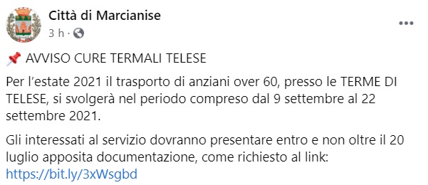 "AVVISO CURE TERMALI TELESE. Per l’estate 2021 il trasporto di anziani over 60, presso le TERME DI TELESE, si svolgerà- si legge nella nota- nel periodo compreso dal 9 settembre al 22 settembre 2021. Gli interessati al servizio dovranno presentare entro e non oltre il 20 luglio apposita documentazione"