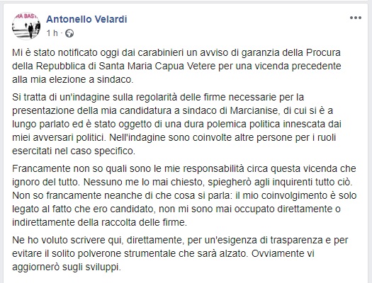 Dopo aver ricevuto un avviso di garanzia dalla Procura della Repubblica di Santa Maria Capua Vetere, Velardi ha così commentato sul profilo Fb