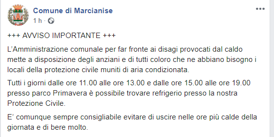Questo il post pubblicato sulla pagina Facebook del Comune di Marcianise: