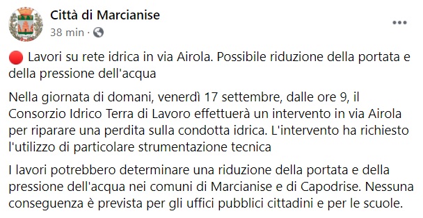 Questo quanto pubblicato sulla pagina fb Città di Marcianise: "Lavori su rete idrica in via Airola. Possibile riduzione della portata e della pressione dell'acqua Nella giornata di domani, venerdì 17 settembre, dalle ore 9, il Consorzio Idrico Terra di Lavoro effettuerà un intervento in via Airola per riparare una perdita sulla condotta idrica. L'intervento ha richiesto l'utilizzo di particolare strumentazione tecnica I lavori potrebbero determinare una riduzione della portata e della pressione dell'acqua nei comuni di Marcianise e di Capodrise. Nessuna conseguenza è prevista per gli uffici pubblici cittadini e per le scuole."