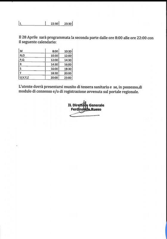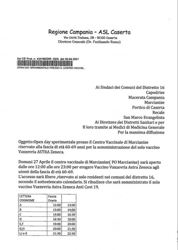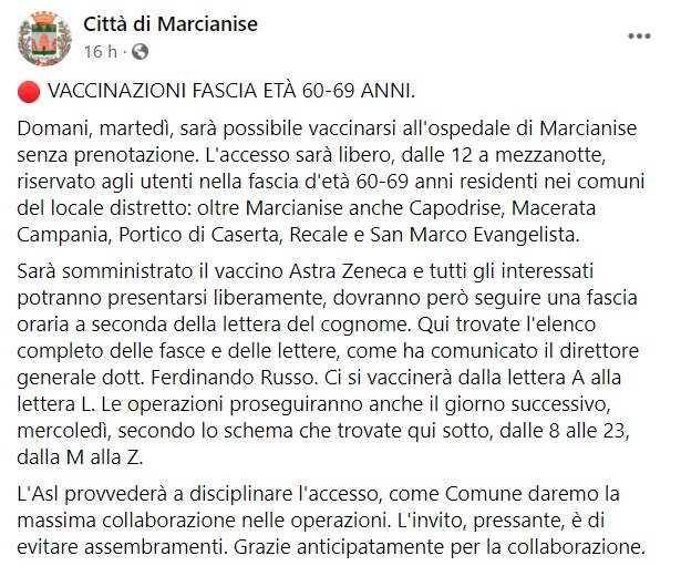 "VACCINAZIONI FASCIA ETÀ 60-69 ANNI. Domani, martedì, sarà possibile vaccinarsi all'ospedale di Marcianise senza prenotazione. L'accesso sarà libero, dalle 12 a mezzanotte, riservato agli utenti nella fascia d'età 60-69 anni residenti nei comuni del locale distretto: oltre Marcianise anche Capodrise, Macerata Campania, Portico di Caserta, Recale e San Marco Evangelista. -Si legge nella nota- Sarà somministrato il vaccino Astra Zeneca e tutti gli interessati potranno presentarsi liberamente, dovranno però seguire una fascia oraria a seconda della lettera del cognome. Qui trovate l'elenco completo delle fasce e delle lettere, come ha comunicato il direttore generale dott. Ferdinando Russo. Ci si vaccinerà dalla lettera A alla lettera L. -Si legge nella nota- Le operazioni proseguiranno anche il giorno successivo, mercoledì, secondo lo schema che trovate qui sotto, dalle 8 alle 23, dalla M alla Z. L'Asl provvederà a disciplinare l'accesso, come Comune daremo la massima collaborazione nelle operazioni. L'invito, pressante, è di evitare assembramenti. Grazie anticipatamente per la collaborazione."