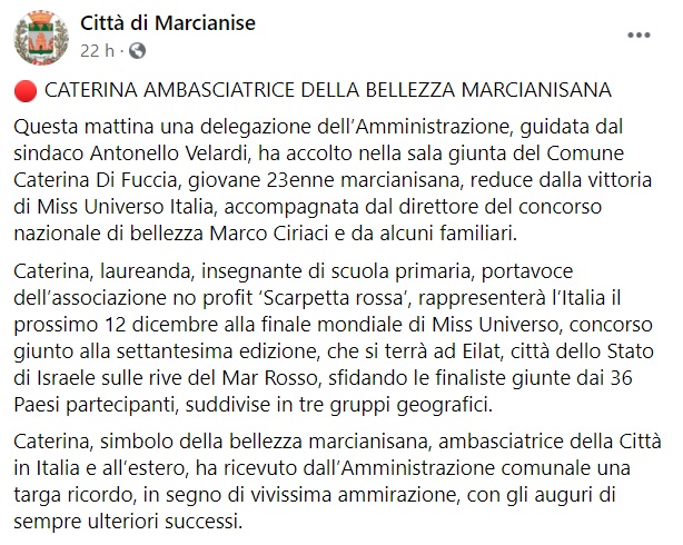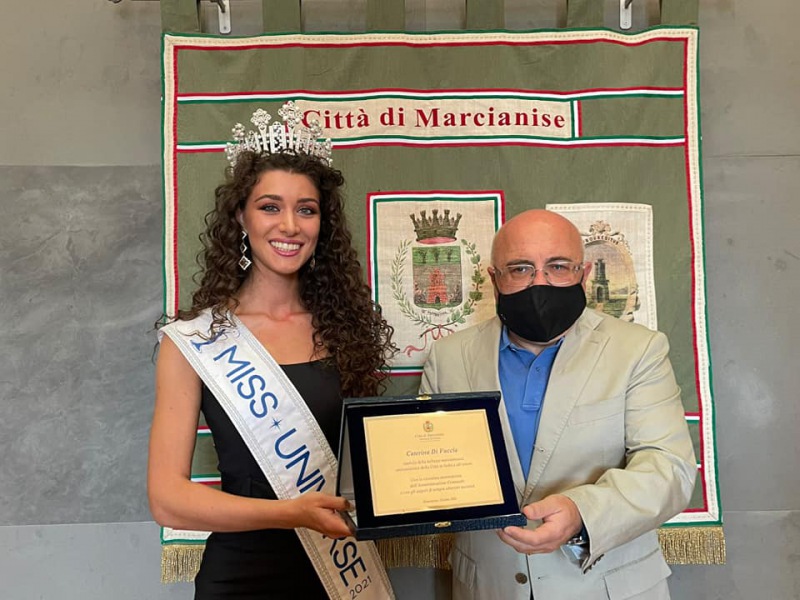 "CATERINA AMBASCIATRICE DELLA BELLEZZA MARCIANISANA. Questa mattina una delegazione dell’Amministrazione, guidata dal sindaco Antonello Velardi, ha accolto nella sala giunta del Comune Caterina Di Fuccia, giovane 23enne marcianisana, reduce- si legge nella nota- dalla vittoria di Miss Universo Italia, accompagnata dal direttore del concorso nazionale di bellezza Marco Ciriaci e da alcuni familiari. Caterina, laureanda, insegnante di scuola primaria, portavoce dell’associazione no profit ‘Scarpetta rossa’, rappresenterà l’Italia il prossimo 12 dicembre alla finale mondiale di Miss Universo, concorso giunto alla settantesima edizione, che si terrà ad Eilat, città dello Stato di Israele sulle rive del Mar Rosso, sfidando le finaliste giunte dai 36 Paesi partecipanti, suddivise in tre gruppi geografici. Caterina, simbolo della bellezza marcianisana, ambasciatrice- si legge nella nota- della Città in Italia e all’estero, ha ricevuto dall’Amministrazione comunale una targa ricordo, in segno di vivissima ammirazione, con gli auguri di sempre ulteriori successi."