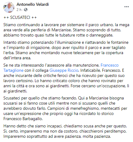 Questo il post pubblicato dal Sindaco di Marcianise Antonello Velardi sulla sua pagina Facebook: "Stiamo continuando a lavorare per sistemare il parco urbano, la mega area verde alla periferia di Marcianise. Stiamo scoprendo di tutto, abbiamo trovato quasi tutte le tubature rotte o danneggiate. Intanto - si legge nel post - stiamo potenziando l'illuminazione e riattavando le fontanine e l'impianto di irrigazione, dopo aver ripulito il parco e aver tagliato l'erba. Stiamo anche montando nuove telecamere per la copertura dell'intera area. Se ne sta interessando l'assessore alla manutenzione, Francesco Tartaglione con il collega Giuseppe Riccio . Infaticabile, Francesco. E anche incurante delle critiche feroci che ha ricevuto per questo suo lavoro certosino. Lo hanno criticato coloro che hanno rovinato per anni la città e ora sono ai giardinetti. Forse cercano un'occupazione, lì ai giardinetti. Scusateci - si legge ancora nel post - per quello che stiamo facendo. Qui a Marcianise bisogna scusarsi se si fanno cose utili mentre non si scusano quelli che avrebbero dovuto farlo. Campioni di menefreghismo, mentecatti per usare un'espressione che proprio oggi ha ricordato lo storico Francesco Barbagallo. Hanno detto che siamo incapaci, chiediamo scusa anche per questo. Sì, certo, impareremo ma non da costoro, chiacchieroni perditempo. Impareremo - conclude il post - soprattutto ad avere pazienza, molta pazienza".