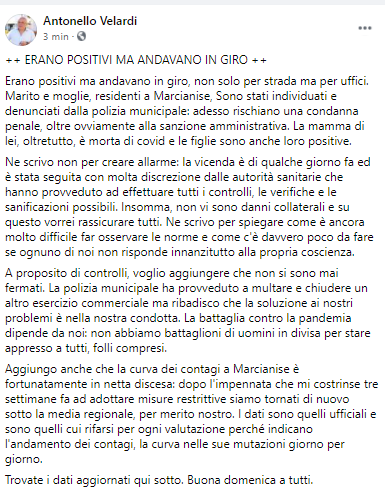 Questo parte del post pubblicato dal Sindaco di Marcianise Antonello Velardi: "(...) Erano positivi ma andavano in giro, non solo per strada ma per uffici. Marito e moglie, residenti a Marcianise, Sono stati individuati e denunciati dalla polizia municipale: adesso rischiano una condanna penale, oltre ovviamente alla sanzione amministrativa. La mamma di lei, oltretutto, è morta di covid e le figlie sono anche loro positive. Ne scrivo - spiega il Sindaco - non per creare allarme: la vicenda è di qualche giorno fa ed è stata seguita con molta discrezione dalle autorità sanitarie che hanno provveduto ad effettuare tutti i controlli, le verifiche e le sanificazioni possibili. Insomma, non vi sono danni collaterali e su questo vorrei rassicurare tutti. Ne scrivo - continua il Sindaco - per spiegare come è ancora molto difficile far osservare le norme e come c'è davvero poco da fare se ognuno di noi non risponde innanzitutto alla propria coscienza. A proposito di controlli, voglio aggiungere che non si sono mai fermati. La polizia municipale ha provveduto a multare e chiudere un altro esercizio commerciale ma ribadisco che la soluzione ai nostri problemi è nella nostra condotta. La battaglia contro la pandemia - prosegue Velardi - dipende da noi: non abbiamo battaglioni di uomini in divisa per stare appresso a tutti, folli compresi. Aggiungo anche che la curva dei contagi a Marcianise è fortunatamente in netta discesa: dopo l'impennata che mi costrinse tre settimane fa ad adottare misure restrittive siamo tornati di nuovo sotto la media regionale, per merito nostro. I dati sono quelli ufficiali e sono quelli cui rifarsi per ogni valutazione perché indicano l'andamento dei contagi, la curva nelle sue mutazioni giorno per giorno. Trovate - conclude il Sindaco - i dati aggiornati qui sotto. Buona domenica a tutti".