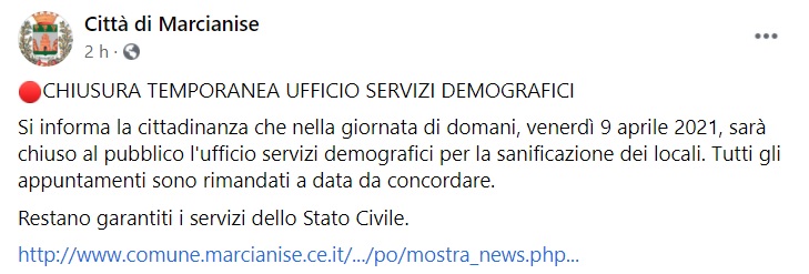 "Si informa la cittadinanza che nella giornata di domani, venerdì 9 aprile 2021, sarà chiuso al pubblico l'ufficio servizi demografici per la sanificazione dei locali. Tutti gli appuntamenti sono rimandati a data da concordare. -si legge nella nota- Restano garantiti i servizi dello Stato Civile. http://www.comune.marcianise.ce.it/.../po/mostra_news.php..."