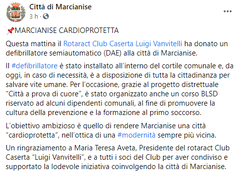 Questo il post pubblicato sulla pagina Facebook 'Città di Marcianise': "Marcianise cardioprotetta. Questa mattina il Rotaract Club Caserta Luigi Vanvitelli ha donato un defibrillatore semiautomatico (DAE) alla città di Marcianise. Il defibrillatore è stato installato all’interno del cortile comunale e, da oggi, in caso di necessità, è a disposizione - si legge nel post - di tutta la cittadinanza per salvare vite umane. Per l’occasione, grazie al progetto distrettuale “Città a prova di cuore”, è stato organizzato anche un corso BLSD riservato ad alcuni dipendenti comunali, al fine di promuovere la cultura della prevenzione e la formazione al primo soccorso. L’obiettivo ambizioso - prosegue il post - è quello di rendere Marcianise una città “cardioprotetta”, nell’ottica di una modernità sempre più vicina. Un ringraziamento a Maria Teresa Aveta, Presidente del rotaract Club Caserta “Luigi Vanvitelli”, e a tutti i soci del Club per aver condiviso e supportato la lodevole iniziativa coinvolgendo la città di Marcianise".