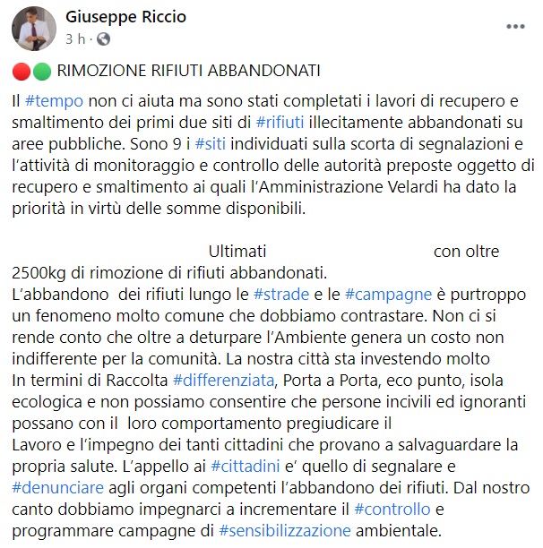 Questo parte di quanto apprendiamo dal profilo facebook dell'Ass. Riccio: