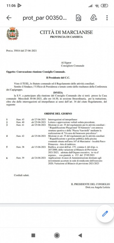 E' stato convocato per mercoledì alle 16.30 il Consiglio comunale di Marcianise. Questo l'ordine del giorno: