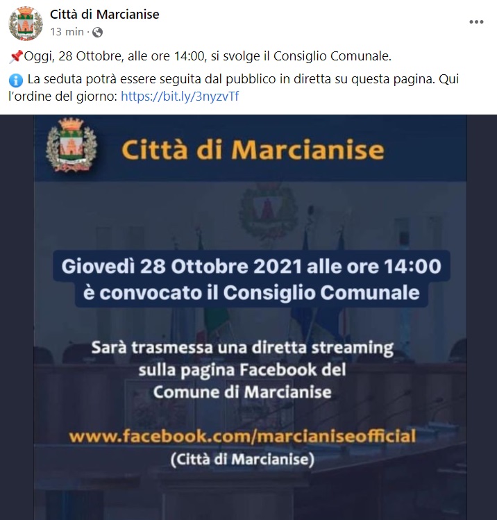 "Oggi, 28 Ottobre, alle ore 14:00, si svolge il Consiglio Comunale. La seduta potrà essere seguita dal pubblico in diretta su questa pagina. Qui l’ordine del giorno: https://bit.ly/3nyzvTf"