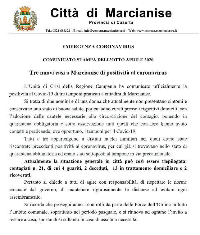 Marcianise. Coronavirus. Tre nuovi casi di positività