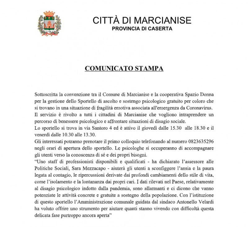 'Sottoscritta la convenzione tra il Comune di Marcianise e la cooperativa Spazio Donna per la gestione dello Sportello di ascolto e sostengo psicologico gratuito per coloro che si trovano in una situazione di fragilità emotiva associata all'emergenza da Coronavirus. Il servizio è rivolto a tutti i cittadini di Marcianise che vogliono intraprendere un percorso di benessere psicologico e affrontare situazioni di disagio sociale. -Si legge nella nota- Lo sportello si trova in via Santoro 4 ed è attivo il giovedì dalle 15.30 alle 18.30 e il venerdì dalle 10.30 alle 13.30. Gli interessati potranno prenotare il primo colloquio telefonando al numero 0823635296 negli orari di apertura dello sportello. Le psicologhe si occuperanno di accompagnare gli utenti verso la conoscenza di sé e dei propri bisogni. “Uno staff di professionisti disponibili e qualificati - ha dichiarato l’assessore alle Politiche Sociali, Sara Mezzacapo - aiuterà gli utenti a sconfiggere l’ansia e la paura legata al contagio, le ripercussioni derivate dai profondi cambiamenti dello stile di vita, come l’isolamento e la lontananza dai propri cari. -Si legge nella nota- I dati rilevati nel Paese, relativamente al disagio psicologico indotto dalla pandemia, sono allarmanti e ci dicono che vanno potenziate le attività concrete e gratuite a sostegno della popolazione. Con l’istituzione di questo sportello l’Amministrazione comunale guidata dal sindaco Antonello Velardi ha voluto offrire uno strumento per aiutare quanti stanno vivendo con difficoltà questa delicata fase purtroppo ancora aperta”'