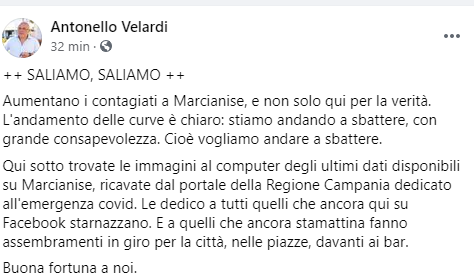 Nuovo intervento del Sindaco di Marcianise Velardi sulla situazione Covid in città. Questo il post da poco pubblicato sulla sua pagina Facebook: "Saliamo, saliamo. Aumentano i contagiati a Marcianise, e non solo qui per la verità. L'andamento delle curve è chiaro: stiamo andando a sbattere, con grande consapevolezza. Cioè vogliamo andare a sbattere. Qui sotto trovate le immagini al computer - prosegue il post - degli ultimi dati disponibili su Marcianise, ricavate dal portale della Regione Campania dedicato all'emergenza covid. Le dedico a tutti quelli che ancora qui su Facebook starnazzano. E a quelli che ancora stamattina - conclude il post - fanno assembramenti in giro per la città, nelle piazze, davanti ai bar. Buona fortuna a noi".