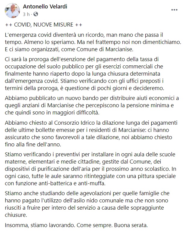 "L'emergenza covid diventerà un ricordo, man mano che passa il tempo. Almeno lo speriamo. Ma nel frattempo noi non dimentichiamo. E ci siamo organizzati, come Comune di Marcianise. Ci sarà la proroga dell'esenzione del pagamento della tassa di occupazione del suolo pubblico per gli esercizi commerciali che finalmente hanno riaperto dopo la lunga chiusura determinata dall'emergenza covid. Stiamo verificando con gli uffici preposti i termini della proroga, è questione di pochi giorni e decideremo. -Si lgge nella nota- Abbiamo pubblicato un nuovo bando per distribuire aiuti economici a quegli anziani di Marcianise che percepiscono la pensione minima e che quindi sono in maggiori difficoltà. Abbiamo chiesto al Consorzio Idrico la dilazione lunga dei pagamenti delle ultime bollette emesse per i residenti di Marcianise: ci hanno assicurato che sono favorevoli a tale dilazione, noi abbiamo chiesto fino alla fine dell'anno. Stiamo verificando i preventivi per installare in ogni aula delle scuole materne, elementari e medie cittadine, gestite dal Comune, dei dispositivi di purificazione dell'aria per il prossimo anno scolastico. -Si lgge nella nota- In ogni caso, tutte le aule saranno ritinteggiate con una pittura speciale con funzione anti-batterica e anti-muffa. Stiamo anche studiando delle agevolazioni per quelle famiglie che hanno pagato l'utilizzo dell'asilo nido comunale ma che non sono riusciti a fruire per intero del servizio a causa delle sopraggiunte chiusure. Insomma, stiamo lavorando. Come sempre. Buona serata."
