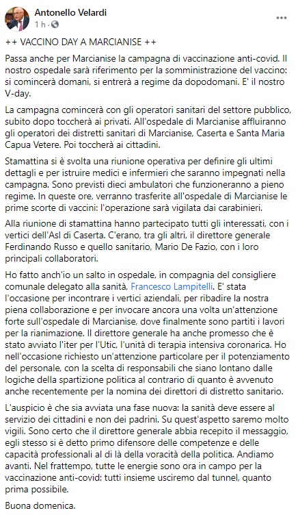 Questo quanto apprendiamo dalla pagina facebook del Sindaco Velardi: