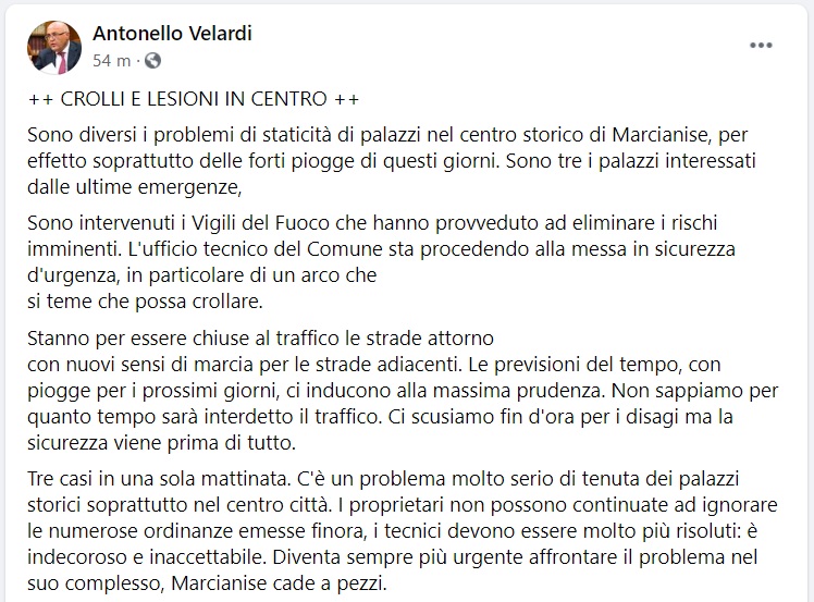 Questo quanto apprendiamo dalla pagina fb del Sindaco Velardi