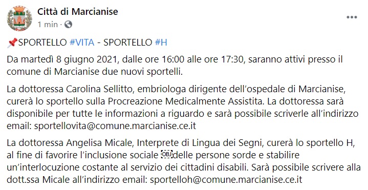 "SPORTELLO #VITA - SPORTELLO #H. Da martedì 8 giugno 2021, dalle ore 16:00 alle ore 17:30, saranno attivi presso il comune di Marcianise due nuovi sportelli. La dottoressa Carolina Sellitto, embriologa dirigente dell’ospedale di Marcianise, curerà- si legge nella nota- lo sportello sulla Procreazione Medicalmente Assistita. La dottoressa sarà disponibile per tutte le informazioni a riguardo e sarà possibile scriverle all’indirizzo email: [email protected] La dottoressa Angelisa Micale, Interprete di Lingua dei Segni, curerà lo sportello H, al fine di favorire l’inclusione sociale delle persone sorde e stabilire un’interlocuzione costante al servizio dei cittadini disabili. Sarà possibile scrivere- si legge nella nota- alla dott.ssa Micale all’indirizzo email: [email protected]"