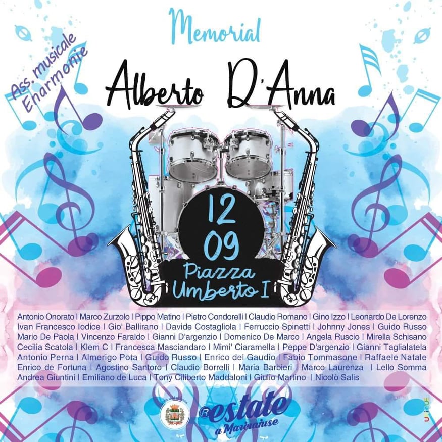 III EDIZIONE “MEMORIAL ALBERTO D’ANNA”. Domani, giovedì 12 settembre, ore 20:30, in piazza Umberto I – MARCIANISE, organizzato dall’Associazione “Enarmonie” in collaborazione con il Comune di Marcianise. Direzione artistica a cura del M° Ivan Francesco Iodice. Saranno ospiti ben 45 musicisti: Antonio Onorato, Marco Zurzolo, Pippo Matino, Pietro Condorelli, Claudio Romano, Gino Izzo, Leonardo De Lorenzo, Ivan Francesco Iodice, Gio' Ballirano, Davide Costagliola, Ferruccio Spinetti, Johnny Jones, Guido Russo, Mario De Paola, Vincenzo Faraldo, Gianni D'Argenzio, Domenico De Marco, Angela Ruscio, Mirella Schisano, Cecilia Scatola, Bruno Persico, Klem C, Francesca Masciandaro, Mimi' Ciaramella, Peppe D'argenzio Gianni Taglialatela, Antonio Perna, Vincenzo Valentino, Almerigo Pota, Guido Russo, Enrico del Gaudio, Fabio Tommasone, Raffaele Natale, Gloria Vardaci, Enrico de Fortuna, Agostino Santoro, Claudio Borrelli, Maria Barbieri, Marco Laurenza, Lello Somma, Andrea Giuntini, Emiliano de Luca, Tony Ciliberto Maddaloni, Giulio Martino, Nicolò Salis.