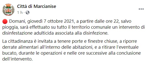 "Domani, giovedì 7 ottobre 2021, a partire dalle ore 22, salvo pioggia, sarà effettuato su tutto il territorio comunale un intervento di disinfestazione adulticida associata alla disinfezione. La cittadinanza è invitata a tenere porte e finestre chiuse, a riporre derrate alimentari all'interno delle abitazioni, e a ritirare- si legge nella nota- l'eventuale bucato, durante le operazioni e nelle ore successive alla conclusione dell’intervento."