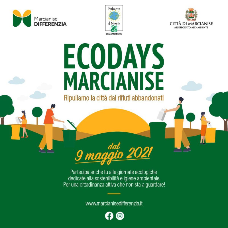 "Cari amici, abbiamo il piacere di comunicarVi che a partire dal giorno 9 maggio 2021, con la collaborazione di alcune associazioni cittadine, abbiamo organizzato delle #giornate dedicate all’Ambiente denominate #ECODAYSMARCIANISE. -Si legge nella nota- Seguirà, nei prossimi giorni, un calendario con tutti gli eventi programmati. Nei giorni 24/25/26 settembre 2021 l’iniziativa si concluderà con l'#ECOFESTIVAL, tre giornate ricche di eventi sui temi della sostenibilità ambientale e della raccolta differenziata, in concomitanza con “Puliamo il Mondo” di #Legambiente. Riteniamo che il nostro esserci, come singoli cittadini sia un dovere oltre che un esempio. Vi invitiamo pertanto a partecipare agli appuntamenti anche in compagnia dei vostri bambini affinché possano crescere tenendo ben presente ciò che è il rispetto per il mondo che ci ospita. -Si legge nella nota- Un anticipo: il 9 maggio il primo evento si terrà nel Rione Medaglie d’Oro a partire dalle ore 9:00. Tutti i partecipanti saranno dotati di pettorine, guanti, mascherine e gadget ufficiali della manifestazione. “Il mondo cambia col tuo esempio, non con la tua opinione” (Paulo Coelho). Vi aspettiamo"