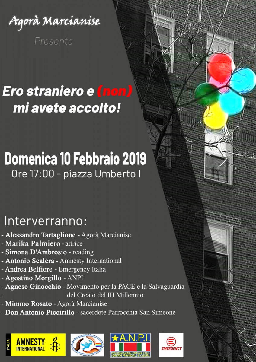 Si terrà a Marcianise, in piazza Umberto I, alle ore 17:00, la manifestazione "Ero straniero e non mi avete accolto". (Ruota il telefono per leggere la locandina, con i nomi di tutti coloro che intervverrano all'evento).