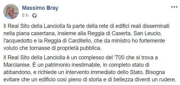 Questo quanto pubblicato su facebook dall'ex Ministro Bray: