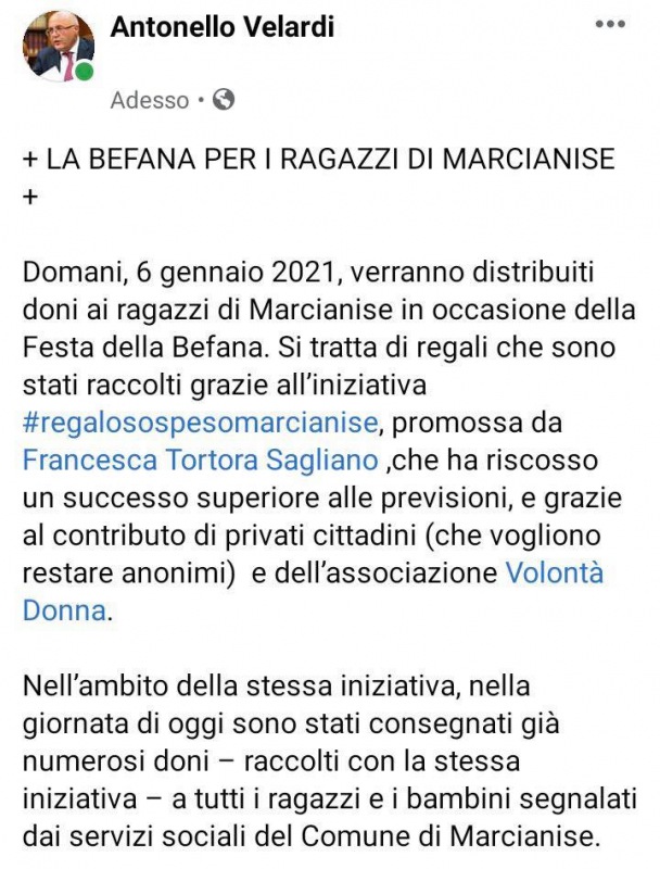Marcianise. Festa della Befana. "Oggi doni ai ragazzi raccolti grazie all'iniziativa del 'regalo sospeso'"