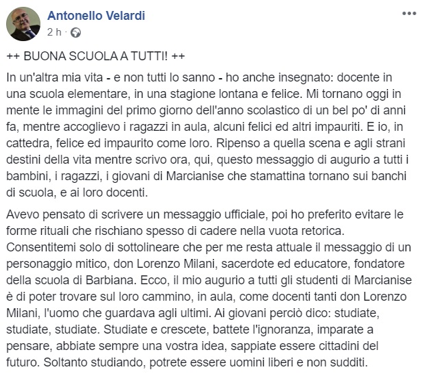 Questo parte di quanto pubblicato sulla pagina Facebook del Sindaco di Marcianise, Antonello Velardi:
