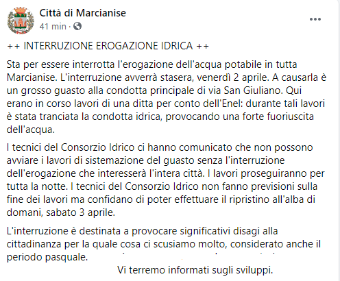 Questo il post pubblicato sulla pagina Facebook 'Città di Marcianise': "Sta per essere interrotta l'erogazione dell'acqua potabile in tutta Marcianise. L'interruzione avverrà stasera, venerdì 2 aprile. A causarla è un grosso guasto alla condotta principale di via San Giuliano. Qui erano in corso lavori di una ditta per conto dell'Enel: durante tali lavori è stata tranciata la condotta idrica, provocando una forte fuoriuscita dell'acqua. I tecnici del Consorzio Idrico - si legge nel post - ci hanno comunicato che non possono avviare i lavori di sistemazione del guasto senza l'interruzione dell'erogazione che interesserà l'intera città. I lavori proseguiranno per tutta la notte. I tecnici del Consorzio Idrico non fanno previsioni sulla fine dei lavori ma confidano di poter effettuare il ripristino all'alba di domani, sabato 3 aprile. L'interruzione - prosegue il post - è destinata a provocare significativi disagi alla cittadinanza per la quale cosa ci scusiamo molto, considerato anche il periodo pasquale. (...). Vi terremo informati sugli sviluppi".