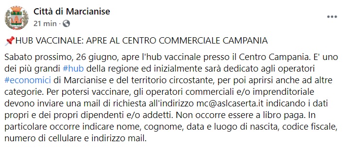 Questo quanto apprendiamo dalla pagina fb del Comune di Marcianise: "HUB VACCINALE: APRE AL CENTRO COMMERCIALE CAMPANIA Sabato prossimo, 26 giugno, apre l'hub vaccinale presso il Centro Campania. E' uno dei più grandi hub della regione ed inizialmente sarà dedicato agli operatori economici di Marcianise e del territorio circostante, per poi aprirsi anche ad altre categorie. Per potersi vaccinare, gli operatori commerciali e/o imprenditoriale devono inviare una mail di richiesta all'indirizzo [email protected] indicando i dati propri e dei propri dipendenti e/o addetti. Non occorre essere a libro paga. In particolare occorre indicare nome, cognome, data e luogo di nascita, codice fiscale, numero di cellulare e indirizzo mail."