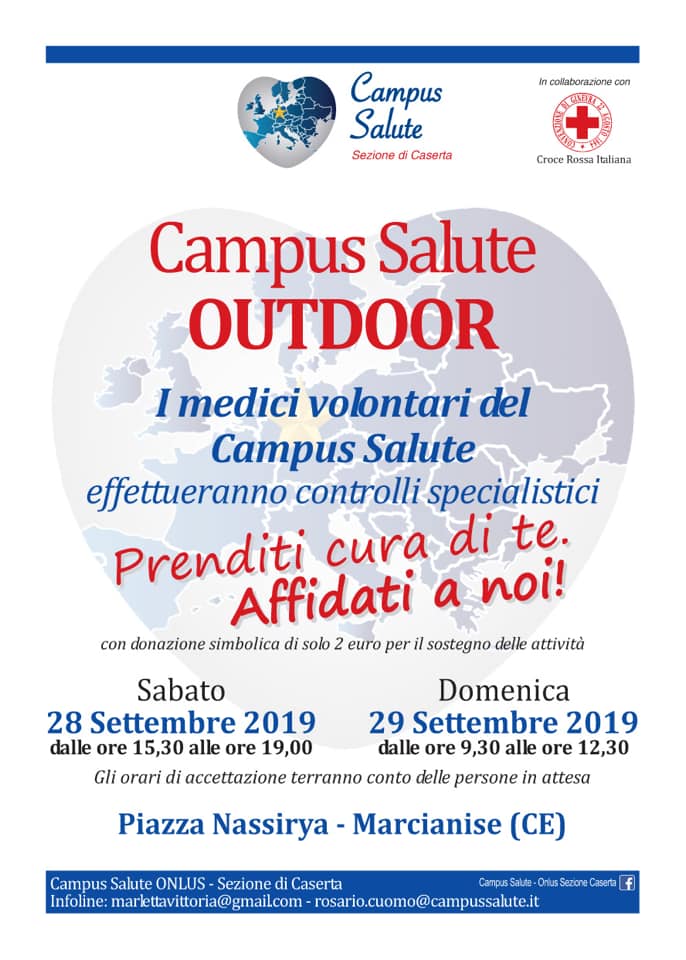 Questo il comunicato stampa giunto in redazione: "Torna Campus Salute Outdoor. Farà tappa a Marcianise in Piazza Nassirya Sabato pomeriggio 28 settembre e domenica mattina 29. Non si ferma mai la macchina organizzativa del Campus Salute Onlus di Caserta, di cui è responsabile, sin dalla sua costituzione, il dottore Rosario Cuomo, Direttore di UOC di Gastroenterologia ed Endoscopia Digestiva presso l’Azienda Ospedaliera di Rilievo Nazionale “Sant’Anna e San Sebastiano” di Caserta. Tutto è pronto per il Villaggio della Salute - si legge nella nota - che sarà allestito a Marcianise, in Piazza Nassirya, il prossimo fine settimana, sabato 28 e domenica 29 settembre: un vero e proprio ospedale da campo con numerosi ambulatori specialistici per avvicinare la popolazione alla visita medica di prevenzione al di fuori delle strutture deputate a tali attività come ospedali, presidi ospedalieri, ambulatori pubblici e privati. La mission dell’Associazione è infatti la promozione e la diffusione della cultura della prevenzione primaria e secondaria delle malattie - si legge nella nota - attraverso molteplici iniziative di tipo sanitario, scientifico e divulgativo. Il Campus Salute Itinerante vede l’impegno e la collaborazione a titolo volontario di un gran numero di soci, sia personale civile che medici, nonché di volontari della Croce Rossa Italiana e della Protezione Civile. Diversi medici volontari, dell’Azienda Ospedaliera e delle Asl di Caserta, effettueranno controlli specialistici. Saranno effettuati screening, indagini e visite gratuite a tutta la cittadinanza. Saranno allestiti numerosi laboratori - si legge nella nota - e le prestazioni mediche riguarderanno le seguenti specializzazioni: cardiologia, gastroenterologia ed epatologia, senologia, dermatologia, endocrinologia e diabetologia, pneumologia, ginecologia. L’evento, patrocinato dal Comune di Marcianise e dall’Ordine dei Medici della Provincia di Caserta, osserverà i seguenti orari: sabato pomeriggio 28 settembre, dalle ore 15.30 alle 19.00 e domenica mattina 29 settembre dalle 9.30 alle 12.30."