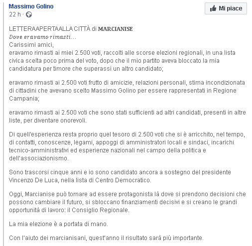 Lo apprendiamo dalla pagina Facebook del candidato Consigliere Regionale, avvocato Massimo Golino.