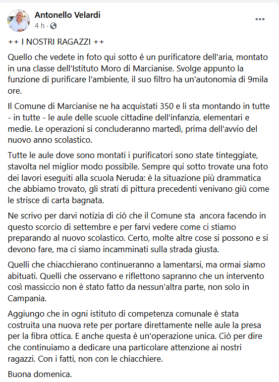 Questo il post pubblicato dal sindaco di Marcianise, Antonello Velardi, su Facebook: "Quello che vedete in foto qui sotto è un purificatore dell'aria, montato in una classe dell'Istituto Moro di Marcianise. Svolge appunto la funzione di purificare l'ambiente, il suo filtro ha un'autonomia di 9mila ore. Il Comune di Marcianise - si legge - ne ha acquistati 350 e li sta montando in tutte - in tutte - le aule delle scuole cittadine dell'infanzia, elementari e medie. Le operazioni si concluderanno martedì, prima dell'avvio del nuovo anno scolastico. Tutte le aule dove sono montati i purificatori - prosegue il post - sono state tinteggiate, stavolta nel miglior modo possibile. Sempre qui sotto trovate una foto dei lavori eseguiti alla scuola Neruda: è la situazione più drammatica che abbiamo trovato, gli strati di pittura precedenti venivano giù come le strisce di carta bagnata. Ne scrivo - prosegue - per darvi notizia di ciò che il Comune sta ancora facendo in questo scorcio di settembre e per farvi vedere come ci stiamo preparando al nuovo scolastico. Certo, molte altre cose si possono e si devono fare, ma ci siamo incamminati sulla strada giusta. Quelli che chiacchierano continueranno a lamentarsi, ma ormai siamo abituati. Quelli che osservano e riflettono sapranno che un intervento così massiccio non è stato fatto da nessun'altra parte, non solo in Campania. Aggiungo - conclude - che in ogni istituto di competenza comunale è stata costruita una nuova rete per portare direttamente nelle aule la presa per la fibra ottica. E anche questa è un'operazione unica. Ciò per dire che continuiamo a dedicare una particolare attenzione ai nostri ragazzi. Con i fatti, non con le chiacchiere. Buona domenica.