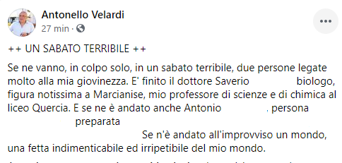 Questo parte del post pubblicato dal Sindaco di Marcianise Antonello Velardi sulla sua pagina Facebook: "Un sabato terribile. Se ne vanno, in colpo solo - si legge nel post - in un sabato terribile, due persone legate molto alla mia giovinezza. E' finito il dottore Saverio (...), biologo, figura notissima a Marcianise, mio professore di scienze e di chimica al liceo Quercia. E se ne è andato anche Antonio (...) persona (...) preparata (...). Se n'è andato all'improvviso un mondo, una fetta indimenticabile ed irripetibile del mio mondo (...)".