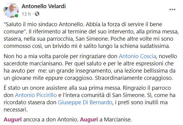 Questo quanto apprendiamo dalla pagina fb del Sindaco Velardi: ""Saluto il mio sindaco Antonello. Abbia la forza di servire il bene comune". Il riferimento al termine del suo intervento, alla prima messa, stasera, nella sua parrocchia - si legge nella nota -, San Simeone. Poche altre volte mi sono commosso così, un brivido mi è salito lungo la schiena sudatissima. Non ho a mia volta parole per ringraziare don Antonio Coscia, novello sacerdote marcianisano. Per quel saluto e per le altre espressioni che ha avuto per me: un grande insegnamento, una lezione bellissima da un giovane mite eppure coraggioso. Straordinariamente coraggioso. È stato un onore assistere alla sua prima messa. Ringrazio il parroco don Antonio Piccirillo - si legge nella nota - e l'intera comunità di San Simeone. Sì, come ha ricordato stasera don Giuseppe Di Bernardo, i preti sono inutili ma necessari. Auguri ancora a don Antonio. Auguri a Marcianise."