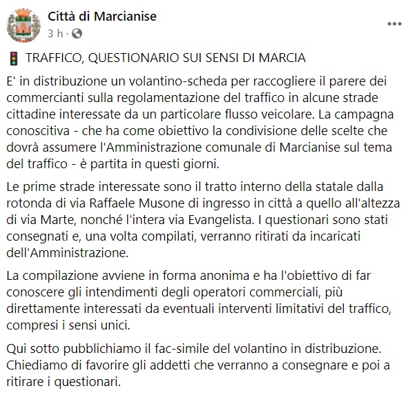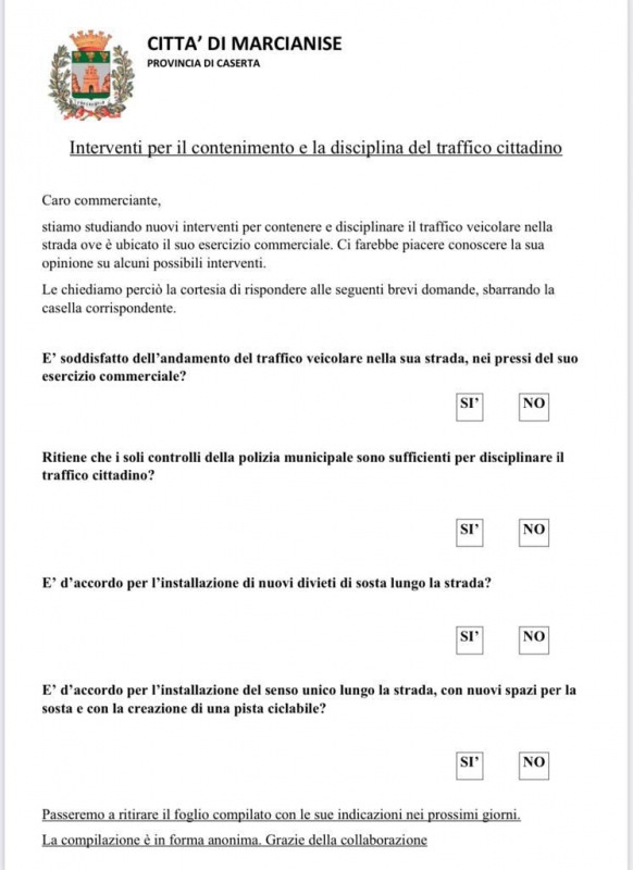 Questo quanto apprendiamo dalla pagina fb del Comune di Marcianise: "TRAFFICO, QUESTIONARIO SUI SENSI DI MARCIA E' in distribuzione un volantino-scheda per raccogliere il parere dei commercianti sulla regolamentazione del traffico in alcune strade cittadine interessate da un particolare flusso veicolare. La campagna conoscitiva - che ha come obiettivo la condivisione delle scelte che dovrà assumere l'Amministrazione comunale di Marcianise sul tema del traffico - è partita in questi giorni. Le prime strade interessate sono il tratto interno della statale dalla rotonda di via Raffaele Musone di ingresso in città a quello all'altezza di via Marte, nonché l'intera via Evangelista. I questionari sono stati consegnati e, una volta compilati, verranno ritirati da incaricati dell'Amministrazione. La compilazione avviene in forma anonima e ha l'obiettivo di far conoscere gli intendimenti degli operatori commerciali, più direttamente interessati da eventuali interventi limitativi del traffico, compresi i sensi unici. Qui sotto pubblichiamo il fac-simile del volantino in distribuzione. Chiediamo di favorire gli addetti che verranno a consegnare e poi a ritirare i questionari."