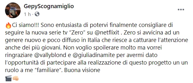 "Ci siamo!!! Sono entusiasta di potervi finalmente consigliare di seguire la nuova serie tv “Zero” su @netflixit . Zero si avvicina ad un genere nuovo e poco diffuso in Italia che riesce a catturare l’attenzione anche dei più giovani. Non voglio spoilerare molto ma- si legge nella nota- vorrei ringraziare @vallyblond e @giuliadinamite per avermi dato l’opportunità di partecipare alla realizzazione di questo progetto un un ruolo a me “familiare”. Buona visione"