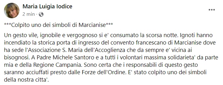 "***Colpito uno dei simboli di Marcianise*** Un gesto vile, ignobile e vergognoso si e' consumato la scorsa notte. Ignoti hanno incendiato la storica porta di ingresso del convento francescano di Marcianise dove ha sede- si legge nella nota- l'Associazione S. Maria dell'Accoglienza che da sempre e' vicina ai bisognosi. A Padre Michele Santoro e a tutti i volontari massima solidarieta' da parte mia e della Regione Campania. Sono certa che i responsabili di questo gesto saranno acciuffati presto dalle Forze dell'Ordine. E' stato colpito uno dei simboli della nostra citta'."