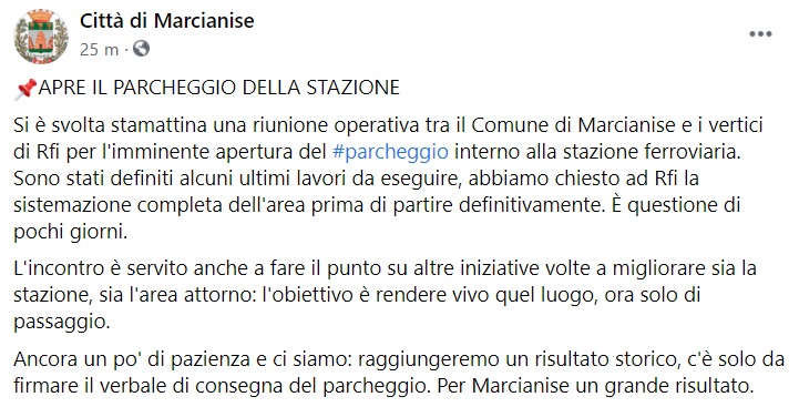 Questo quanto apprendiamo dalla pagina fb di Città di Marcianise: "APRE IL PARCHEGGIO DELLA STAZIONE Si è svolta stamattina una riunione operativa tra il Comune di Marcianise e i vertici di Rfi per l'imminente apertura del #parcheggio interno alla stazione ferroviaria. Sono stati definiti alcuni ultimi lavori da eseguire, abbiamo chiesto ad Rfi la sistemazione completa dell'area prima di partire definitivamente. È questione di pochi giorni. L'incontro è servito anche a fare il punto su altre iniziative volte a migliorare sia la stazione, sia l'area attorno: l'obiettivo è rendere vivo quel luogo, ora solo di passaggio. Ancora un po' di pazienza e ci siamo: raggiungeremo un risultato storico, c'è solo da firmare il verbale di consegna del parcheggio. Per Marcianise un grande risultato."