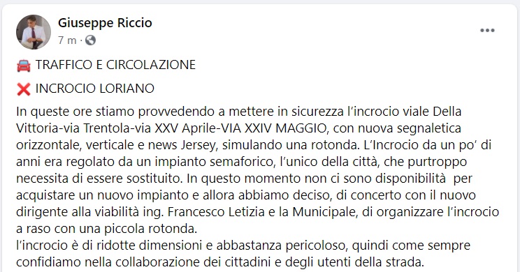 Questo quanto pubblicato sulla pagina fb dell'Ass. Riccio: "TRAFFICO E CIRCOLAZIONE INCROCIO LORIANO In queste ore stiamo provvedendo a mettere in sicurezza l’incrocio viale Della Vittoria-via Trentola-via XXV Aprile-VIA XXIV MAGGIO - si legge nella nota -, con nuova segnaletica orizzontale, verticale e news Jersey, simulando una rotonda. L’Incrocio da un po’ di anni era regolato da un impianto semaforico, l’unico della città, che purtroppo necessita di essere sostituito. In questo momento non ci sono disponibilità per acquistare un nuovo impianto - si legge nella nota - e allora abbiamo deciso, di concerto con il nuovo dirigente alla viabilità ing. Francesco Letizia e la Municipale, di organizzare l’incrocio a raso con una piccola rotonda. L’incrocio è di ridotte dimensioni e abbastanza pericoloso, quindi come sempre confidiamo nella collaborazione dei cittadini e degli utenti della strada."