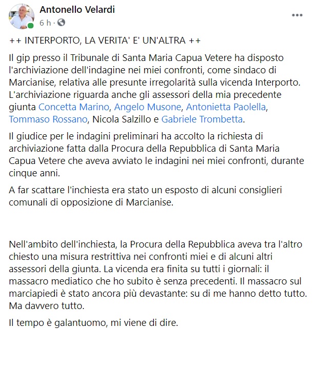 "++ INTERPORTO, LA VERITA' E' UN'ALTRA ++ Il gip presso il Tribunale di Santa Maria Capua Vetere ha disposto l'archiviazione dell'indagine nei miei confronti, come sindaco di Marcianise, relativa alle presunte irregolarità sulla vicenda Interporto. L'archiviazione- si legge nella nota- riguarda anche gli assessori della mia precedente giunta Concetta Marino, Angelo Musone, Antonietta Paolella, Tommaso Rossano, Nicola Salzillo e Gabriele Trombetta. Il giudice per le indagini preliminari ha accolto la richiesta di archiviazione fatta dalla Procura della Repubblica di Santa Maria Capua Vetere che aveva avviato le indagini nei miei confronti, durante cinque anni. A far scattare l'inchiesta era stato un esposto di alcuni consiglieri comunali di opposizione di Marcianise. .... Nell'ambito dell'inchiesta, la Procura della Repubblica aveva tra l'altro chiesto una misura restrittiva nei confronti miei e di alcuni altri assessori della giunta. La vicenda era finita su tutti i giornali: il massacro mediatico che ho subito è senza precedenti. Il massacro sul marciapiedi è stato ancora- si legge nella nota- più devastante: su di me hanno detto tutto. Ma davvero tutto. Il tempo è galantuomo, mi viene di dire. ..."