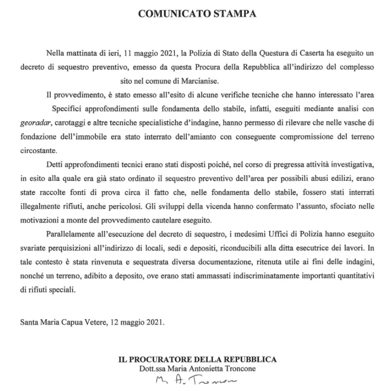 Pubblichiamo nota stampa della Procura di SMCV