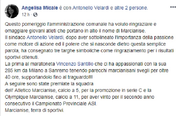 Questo il post pubblicato sulla pagina fb ufficiale dell'Ass. Angelisa Micale.
