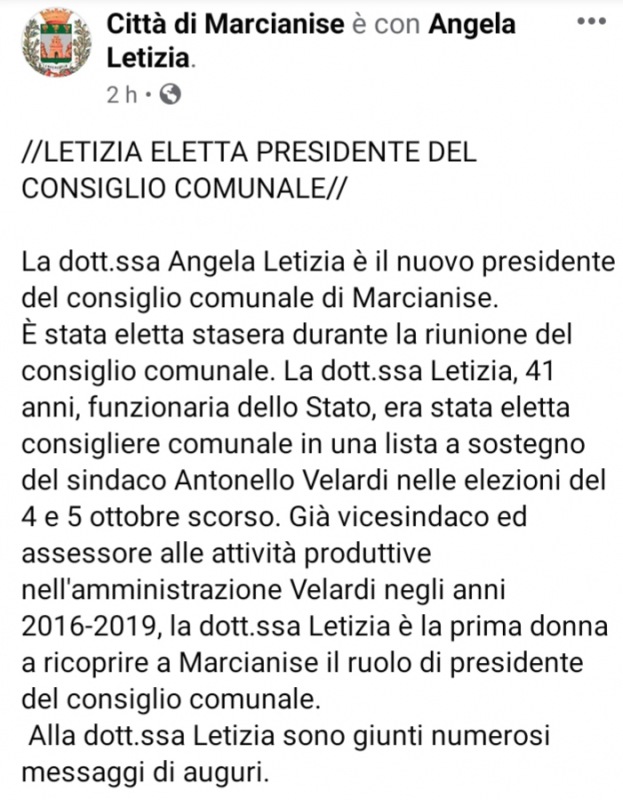 L'ex Vice Sindaco di Marcianise, la dottoressa Angela Letizia e' il nuovo Presidente del Consiglio Comunale della citta' casertana. Lo ha deciso l'assise di ieri sera. Ecco il post ufficiale della Citta' di Marcianise. Il nostro in bocca al lupo alla dott.ssa Letizia.
