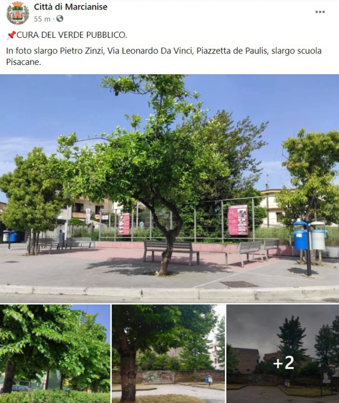 Questo quanto pubblicato sulla pagina fb del Comune di Marcianise: "CURA DEL VERDE PUBBLICO. In foto slargo Pietro Zinzi, Via Leonardo Da Vinci, Piazzetta de Paulis, slargo scuola Pisacane."