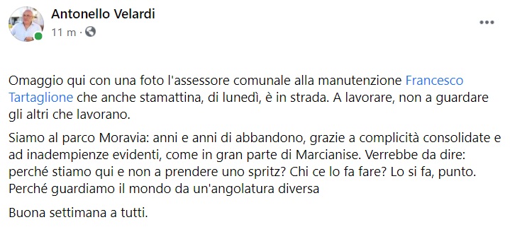 Questo quanto apprendiamo dalla pagina fb del Sindaco Velardi: "Omaggio qui con una foto l'assessore comunale alla manutenzione Francesco Tartaglione che anche stamattina, di lunedì, è in strada. A lavorare, non a guardare gli altri che lavorano. Siamo al parco Moravia: anni e anni di abbandono, grazie a complicità consolidate e ad inadempienze evidenti, come in gran parte di Marcianise. Verrebbe da dire: perché stiamo qui e non a prendere uno spritz? Chi ce lo fa fare? Lo si fa, punto. Perché guardiamo il mondo da un'angolatura diversa Buona settimana a tutti."