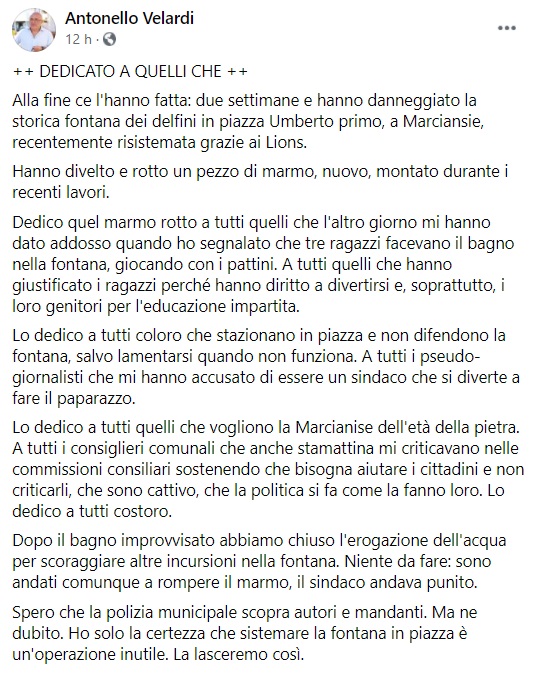 Questo quanto apprendiamo dalla pagina fb del Sindaco Velardi: "DEDICATO A QUELLI CHE Alla fine ce l'hanno fatta: due settimane e hanno danneggiato la storica fontana dei delfini in piazza Umberto primo, a Marciansie, recentemente risistemata grazie ai Lions. Hanno divelto e rotto un pezzo di marmo, nuovo, montato durante i recenti lavori. Dedico quel marmo rotto a tutti quelli che - si legge nella nota - l'altro giorno mi hanno dato addosso quando ho segnalato che tre ragazzi facevano il bagno nella fontana, giocando con i pattini. A tutti quelli che hanno giustificato i ragazzi perché hanno diritto a divertirsi e, soprattutto, i loro genitori per l'educazione impartita. Lo dedico a tutti coloro che stazionano in piazza e non difendono la fontana, salvo lamentarsi quando non funziona. A tutti i pseudo-giornalisti - si legge nella nota - che mi hanno accusato di essere un sindaco che si diverte a fare il paparazzo. Lo dedico a tutti quelli che vogliono la Marcianise dell'età della pietra. A tutti i consiglieri comunali che anche stamattina mi criticavano nelle commissioni consiliari sostenendo che bisogna aiutare i cittadini e non criticarli, che sono cattivo, che la politica si fa come la fanno loro. Lo dedico a tutti costoro. Dopo il bagno improvvisato abbiamo chiuso l'erogazione dell'acqua - si legge nella nota - per scoraggiare altre incursioni nella fontana. Niente da fare: sono andati comunque a rompere il marmo, il sindaco andava punito. Spero che la polizia municipale scopra autori e mandanti. Ma ne dubito. Ho solo la certezza che sistemare la fontana in piazza è un'operazione inutile. La lasceremo così."