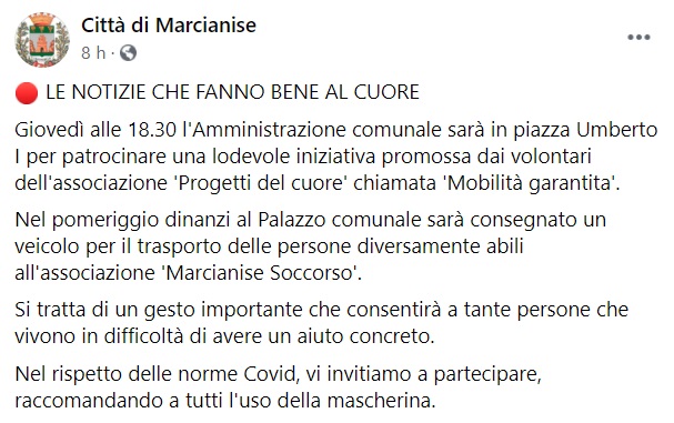 Questo quanto apprendiamo dalla pagina fb del Comune di Marcianise: "LE NOTIZIE CHE FANNO BENE AL CUORE Giovedì alle 18.30 l'Amministrazione comunale sarà in piazza Umberto I per patrocinare una lodevole iniziativa promossa dai volontari dell'associazione 'Progetti del cuore' chiamata 'Mobilità garantita'. Nel pomeriggio - si legge nella nota - dinanzi al Palazzo comunale sarà consegnato un veicolo per il trasporto delle persone diversamente abili all'associazione 'Marcianise Soccorso'. Si tratta di un gesto importante che consentirà a tante persone che vivono in difficoltà di avere un aiuto concreto. Nel rispetto delle norme Covid, vi invitiamo a partecipare, raccomandando a tutti l'uso della mascherina."
